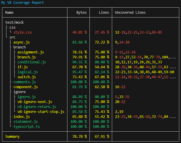 Show coverage details in the console. Like text, but for V8. For Github actions, we can enforce color with env: FORCE_COLOR: true.
