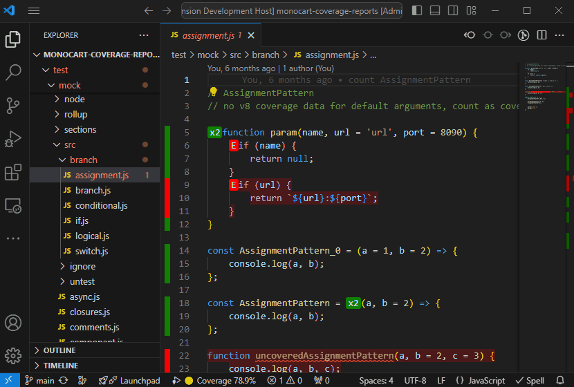 CoverageResultsto a json file (defaults tocoverage-report.json). - Shows native V8 code coverage with VSCode extension: Monocart Coverage for VSCode